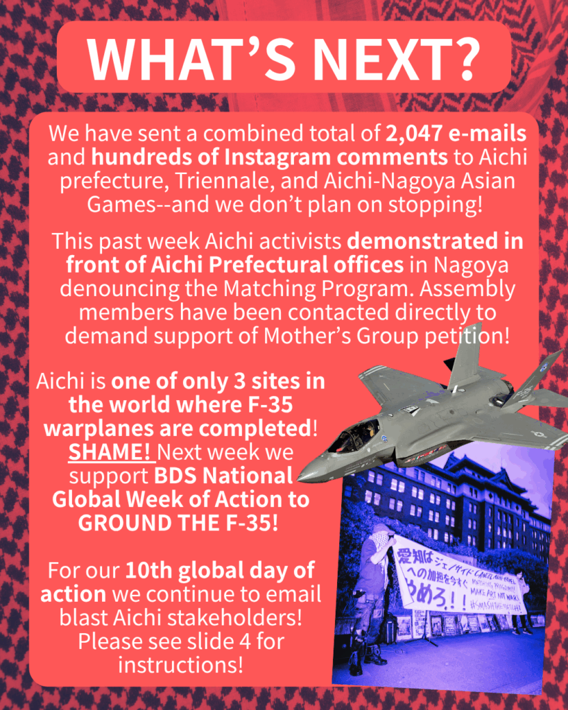Now in our 10th week, we need to keep the pressure on. The Nagoya Mothers for Palestinian Children handed in their petition on 17/09, but the only thing that will get it heard sooner is making it a BIG international issue that the governor of Aichi (Omura) will ultimately prioritise as it becomes an unavoidable issue. He is now on the list of people you e-mail when you send the petition, as well as the Obayashi Corporation, the main sponsor of the Aichi Triennale. They are complicit in both the occupation of Okinawa through its construction of the Henoko base, AND a BDS violator for employing Innoviz laser technology in doing so from the Zionist Entity!