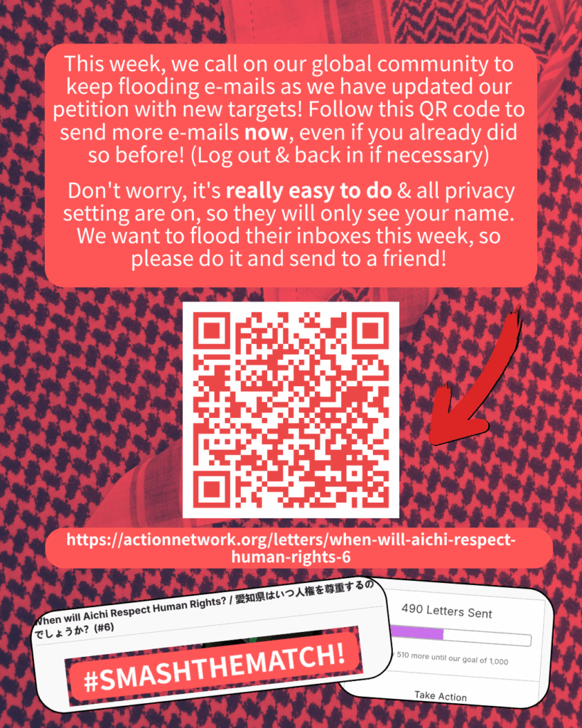 With over 2,000 e-mails sent and hundreds of comments posted on Aichi-related pages, the recent disruption and takeover of the Aichi Triennale, & the RESIGNATION of the corporate liaison connected to the Aichi-Israel Matching Program from the Triennale Committee, the SMASHTHEMATCH campaign just keeps going!!