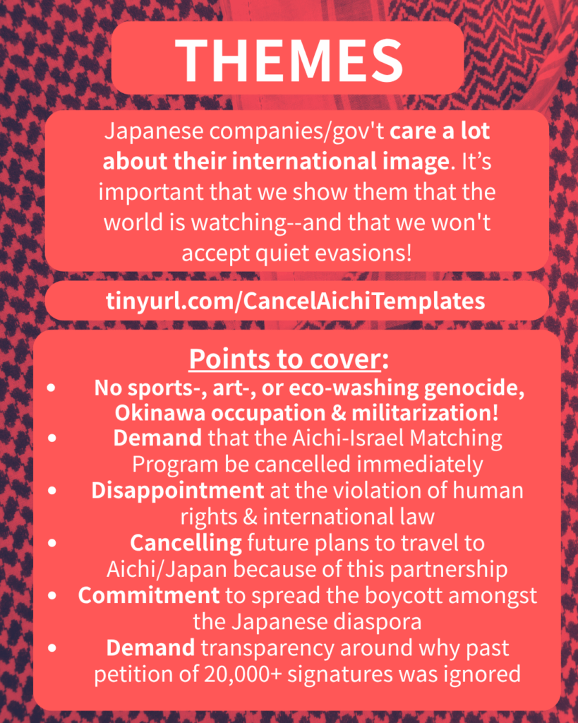 DO NOT think your comments and emails are meaningless. We consistently hear back from our comrades in Japan that it 1) boosts local organisers’ confidence, 2) creates a headache and pressure on Aichi officials who care a lot about their int’l ‘image’, and 3) creates the ‘chatter’ that gets reporters and human rights orgs interested in the deep-investigative work we need to PROVE the despicable genocidal links in the global supply chain locally in Aichi.