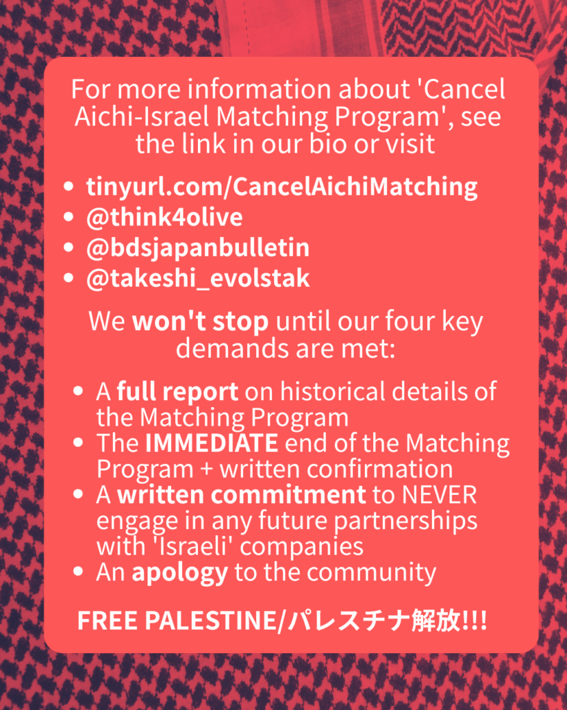 - Demand that the Aichi-Israel Matching Program be cancelled immediately