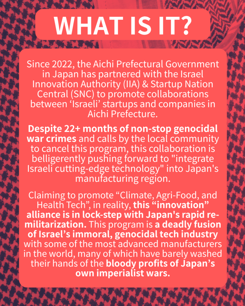 Despite 22+ months of non-stop genocidal war crimes and calls by the local community to cancel this program, this collaboration is belligerently pushing forward to “integrate Israeli cutting-edge technology” into Japan’s manufacturing region.
