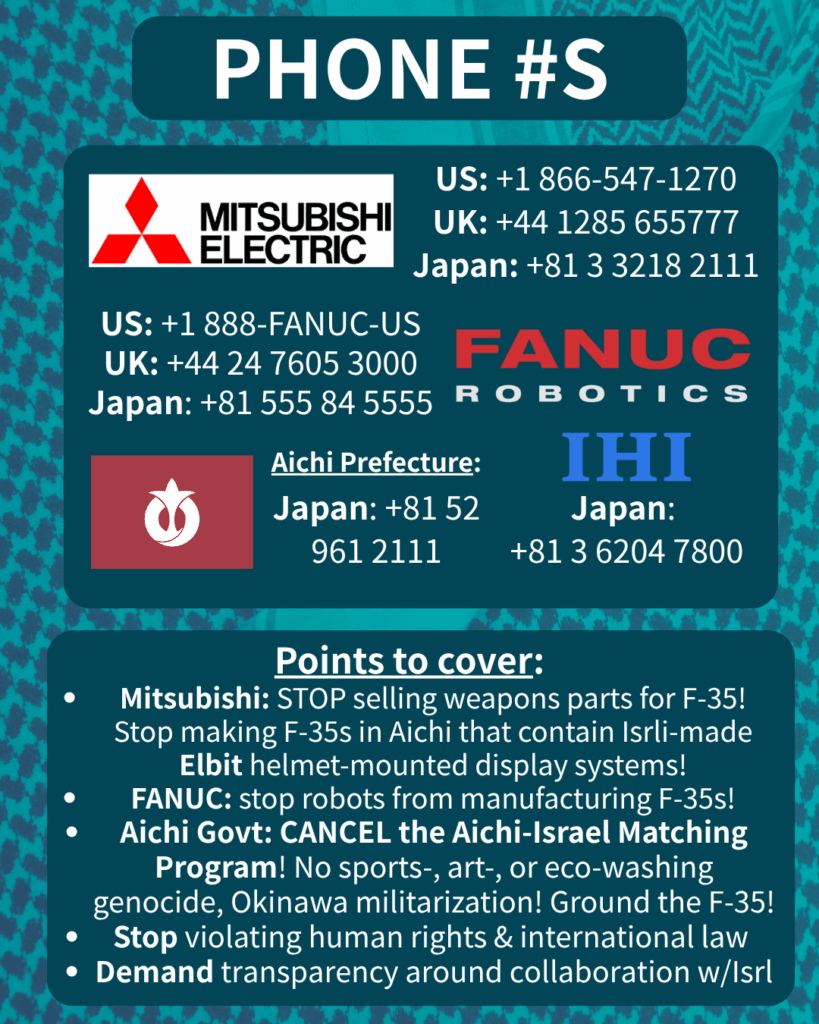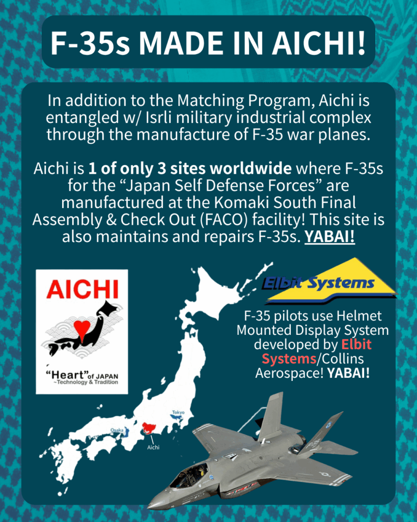 In our 11th week of action, we are coordinating with the #GROUNDF35 actions around the world, and hope to highlight the chilling truth that the international community still hasn’t fully appreciated: AICHI PREFECTURE IS ONE OF 3 PLACES IN THE WORLD where these ‘genocide jets’ are completed, USING TECHNOLOGY FROM ELBIT SYSTEMS (amongst others)! Aichi is a KEY link in the genocidal supply chain, and our comrades in Japan need your help in exposing & breaking it!