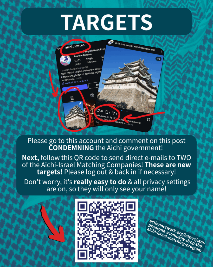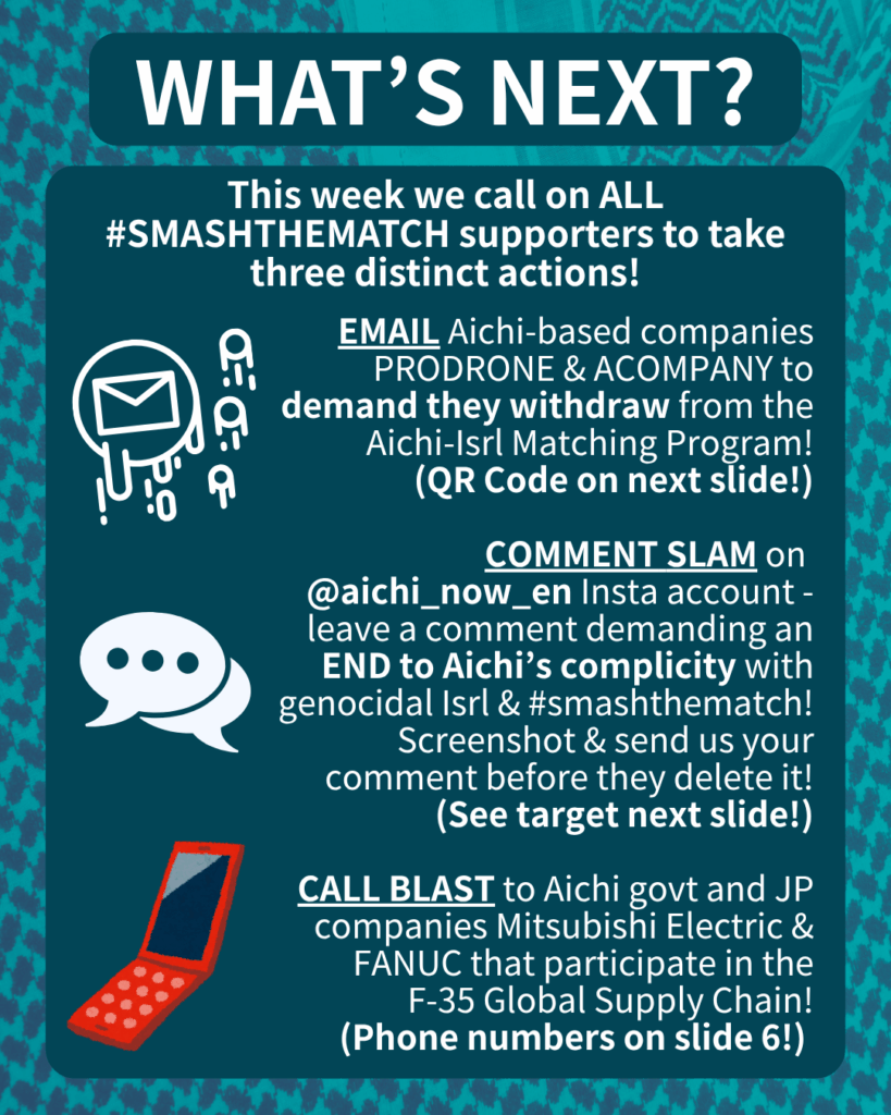 [Speech bubble emoji] COMMENT SLAM on @aichi_now_en Insta account – leave a comment demanding an END to Aichiâs complicity with genocidal Isrl & #smashthematch! Screenshot & send us your comment before they delete it!