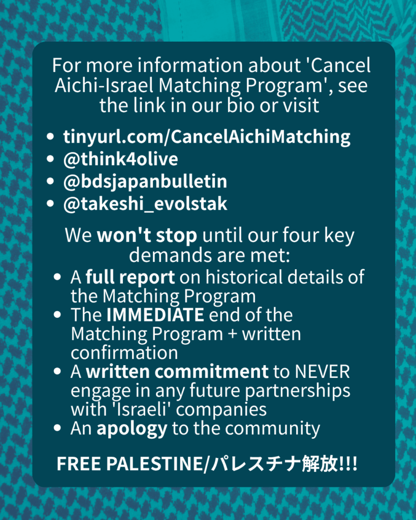 In addition to the Matching Program, Aichi is entangled w/ Isrli military industrial complex through the manufacture of F-35 war planes.