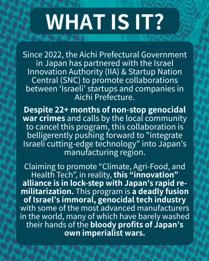 Despite 22+ months of non-stop genocidal war crimes and calls by the local community to cancel this program, this collaboration is belligerently pushing forward to âintegrate Israeli cutting-edge technologyâ into Japanâs manufacturing region.